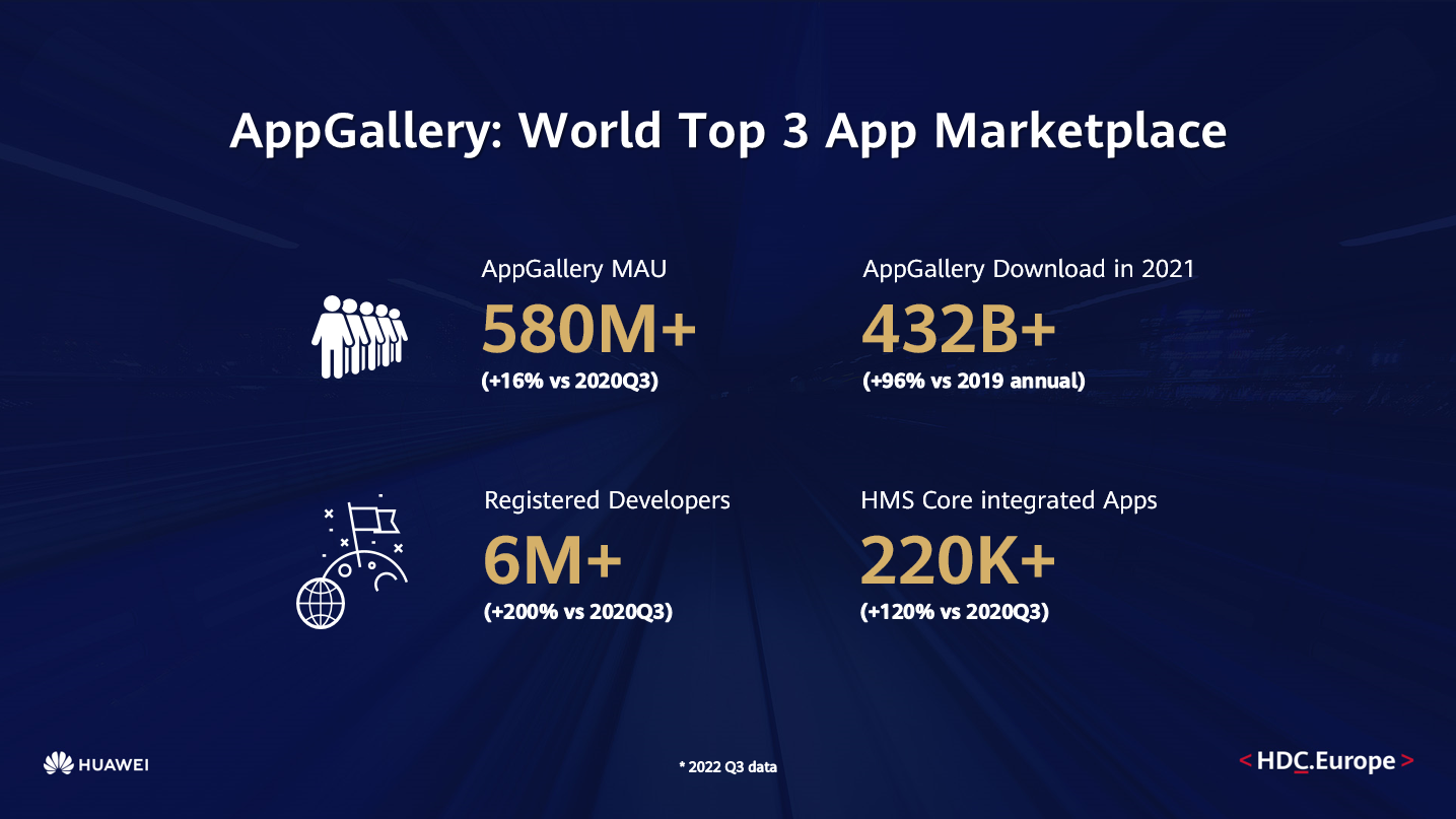据悉,全球网络峰会(Web Summit)是欧洲规模最大的技术网络大会,汇集了全球软件服务(SaaS)、游戏、人工智能、电子商务等互联网顶尖企业和行业技术精英。华为作为历届全球网络峰会的重要参会者,其欧洲消费者业务负责人在此次大会上表示,与华为生态系统合作伙伴一起,华为持续巩固了全球第三大移动生态系统的地位,2022年第三季度,AppGallery全球月活已超过5.8亿人次,同比提升16%;2021年,用户在AppGallery上下载移动应用次数达4,320亿次,较2019年增长96%。